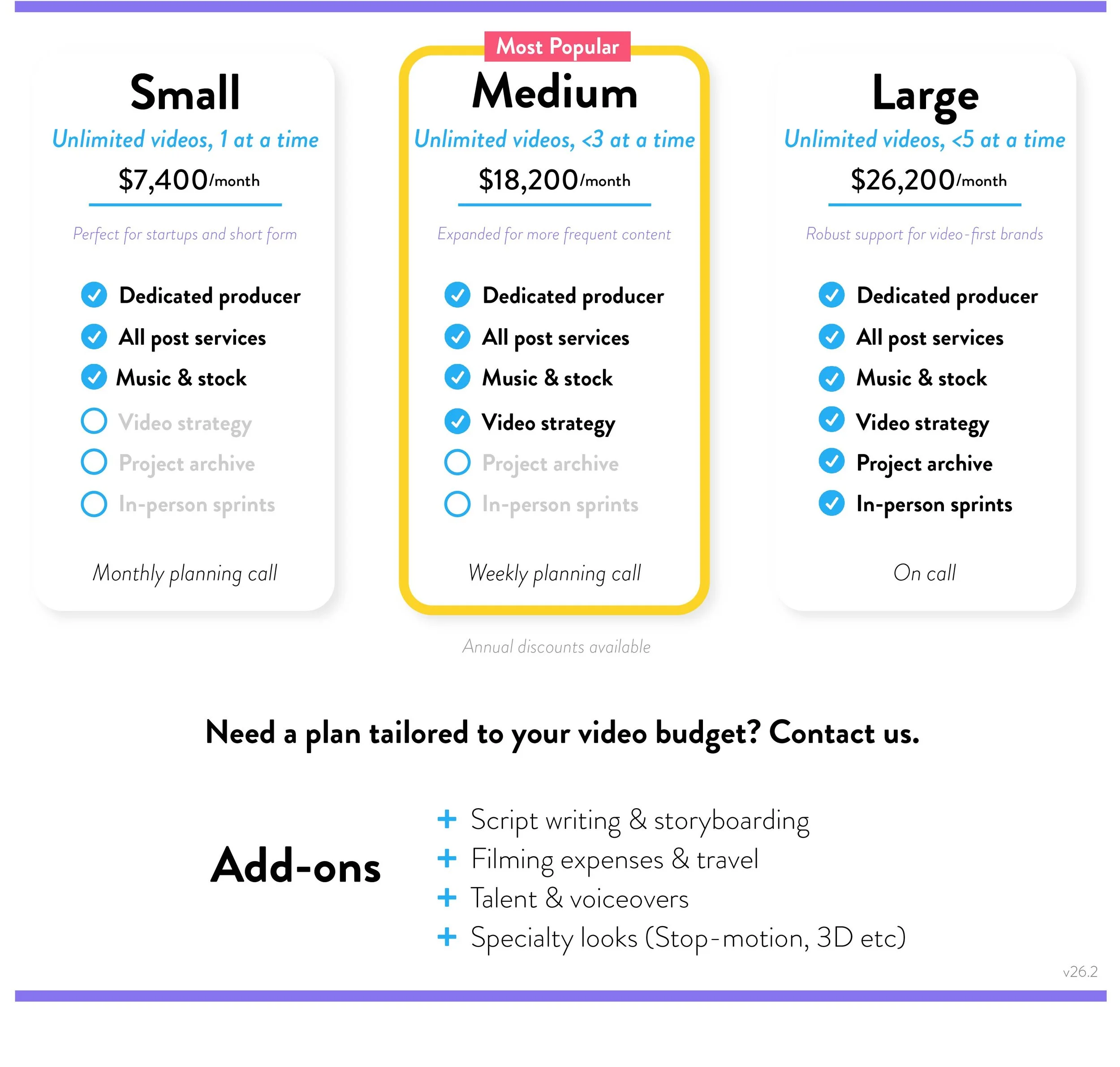 Any type! These plans work best for smaller, ongoing video needs. Think of us as a remote video department, or an expansion pack to your team. We’ll determine if a project doesn’t fit within your monthly plan, and give you a quote for bigger projects.